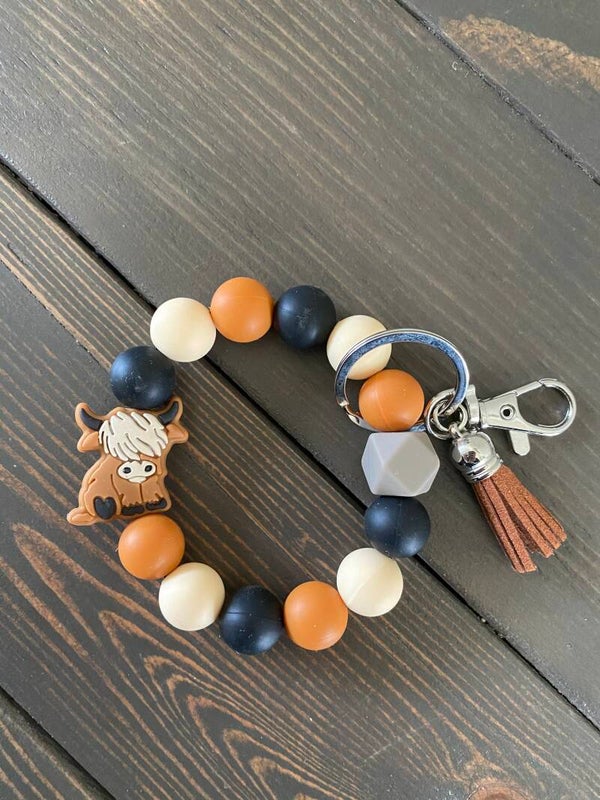 Adorable handmade Brown highland cow keychain available. Silicone beads with Highland cow focal bead and tassel.