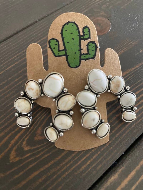 Stunning western squash earrings featuring silver metal and cream marbled Howlite imitation stones. Enjoy lightweight comfort with this eye-catching look. The faux Howlite stones provide a brilliant finishing touch with their unique color pattern. Add a stylish western flair to your outfit with these beautiful post back earrings.