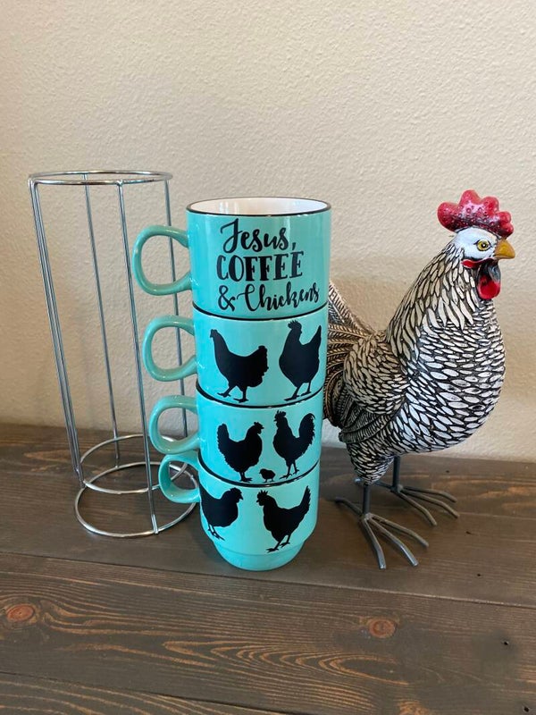 This chicken inspired stacking mug set is perfect for coffee lovers. Featuring Jesus, Coffee and Chickens the set includes four 8oz stoneware mugs with a teal and black design. The sturdy metal stand keeps the mugs neatly stacked, saving space and adding a touch of rustic charm to any kitchen.