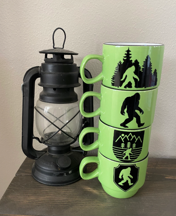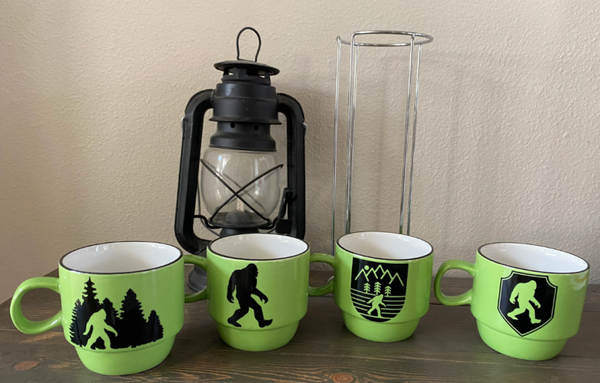 This set of 4 lime green ceramic mugs features detailed black Bigfoot designs. Perfect for stacking on the metal stand, they add a touch of whimsy to any kitchen. Each mug holds 8oz, making them the ideal size for a morning cup of coffee or afternoon tea.